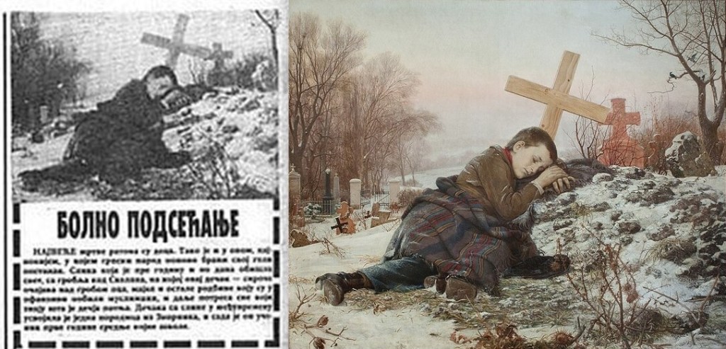Examples include the newspaper Večernje Novosti publishing a story of a Serbian child whose entire family was killed by Bosnian Muslims, illustrated by a picture of the grieving orphan. Except the picture was Uroš Predić’s 1888 painting Siroče (Orphan on mother’s grave)